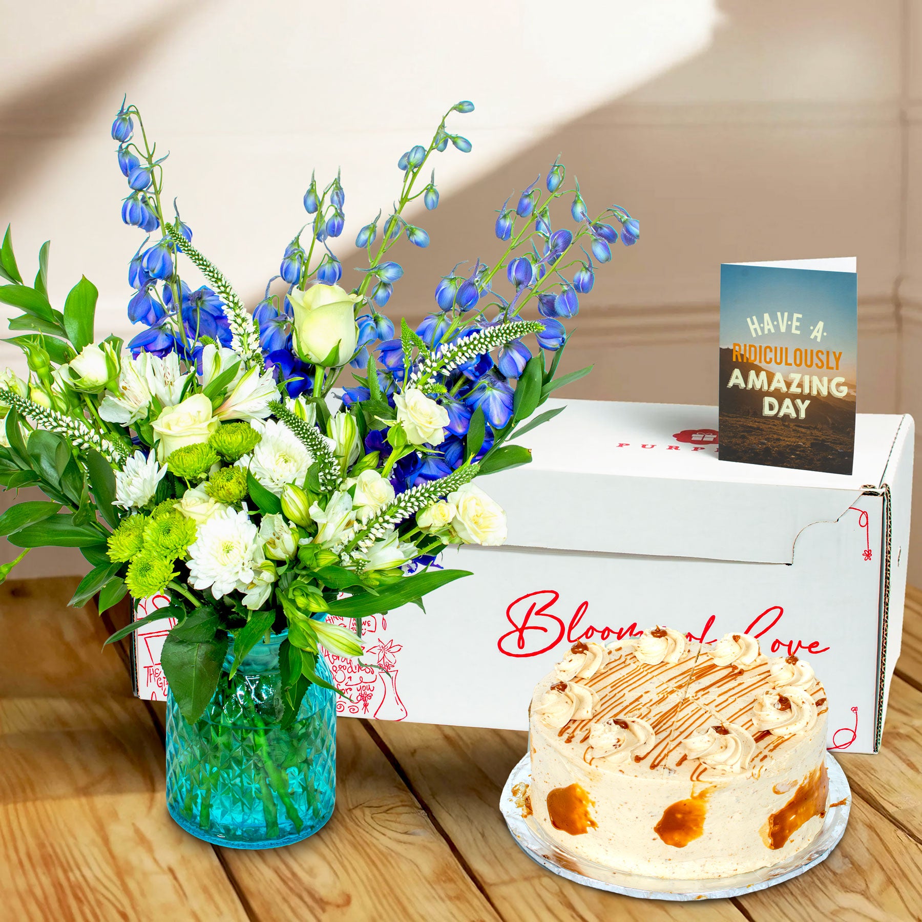 Celebrate April big celebrations with a perfect pairing — a rich butterscotch cake and the Milana bouquet, featuring soft white blooms and fresh green accents.