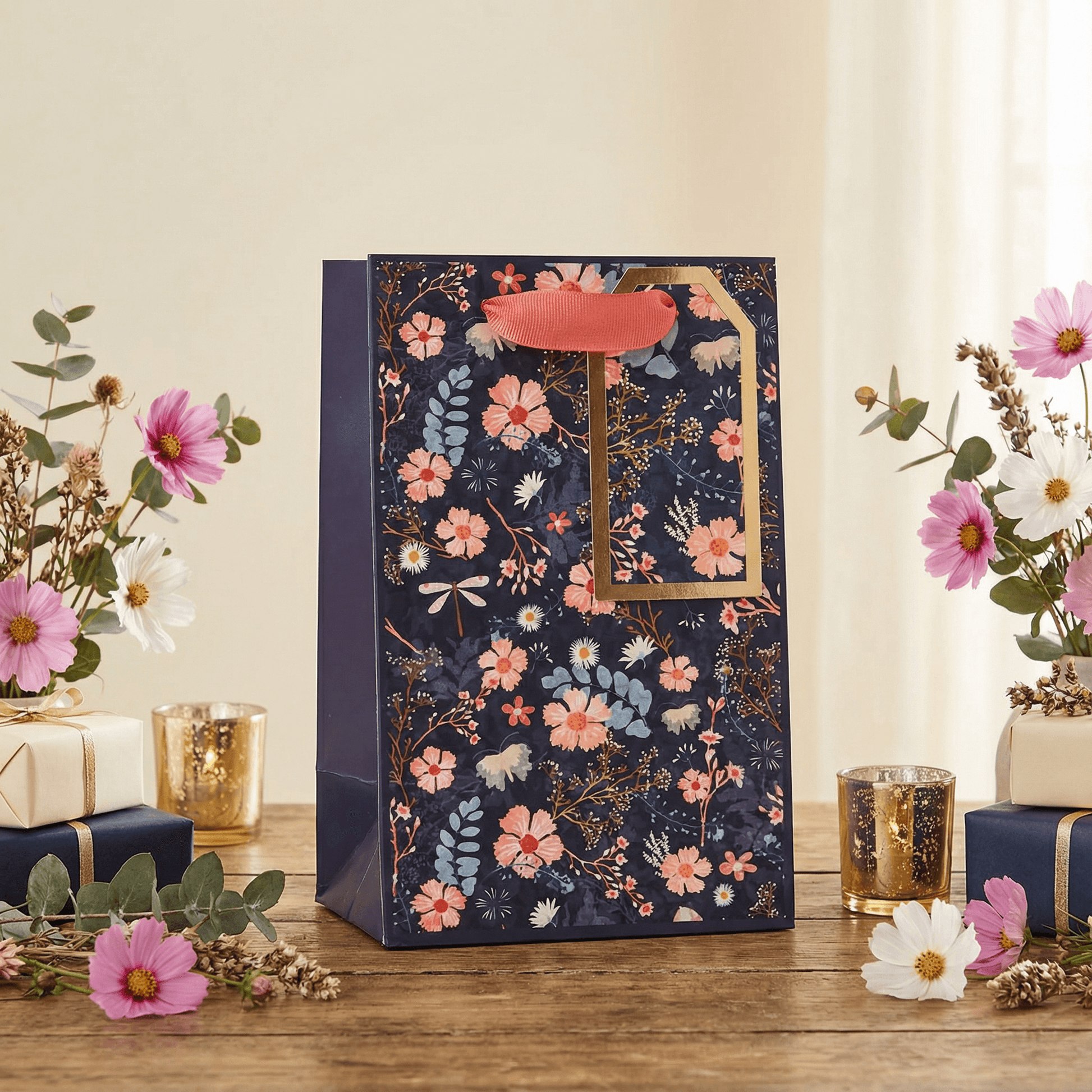 Make every gift feel like an experience with the Midnight Madness Floral Gift Bag Collection. Designed in a rich midnight-navy palette and adorned with soft peach, coral and blue botanical illustrations, this gift bag range brings an elegant, boutique-quality finish to any present.