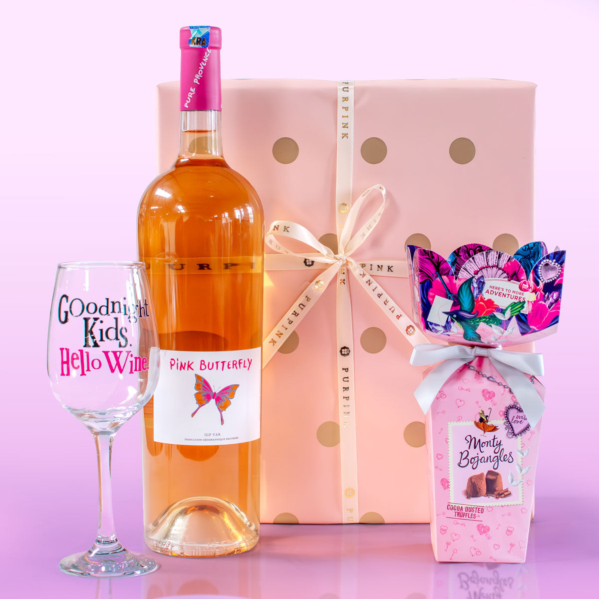 Pink Butterfly Dry Rosé Wine (1.5L) : A crisp, refreshing rosé with delicate floral notes, perfect for toasting to special moments.