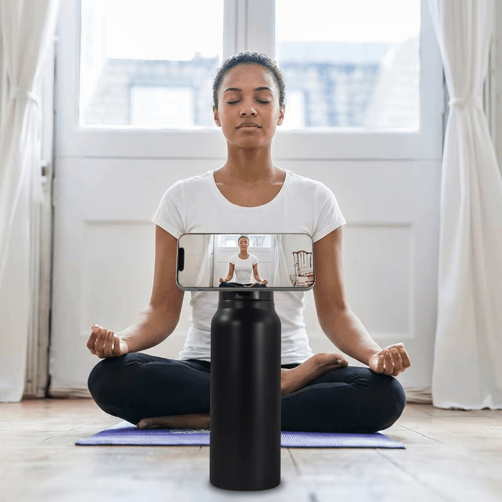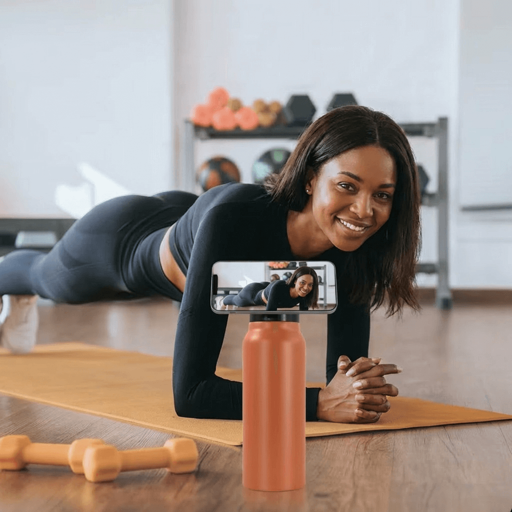 The SnapStand is a premium insulated water bottle with a built-in MagSafe magnetic phone mount — designed for hands-free filming, scrolling, streaming, and video calls wherever you are.
